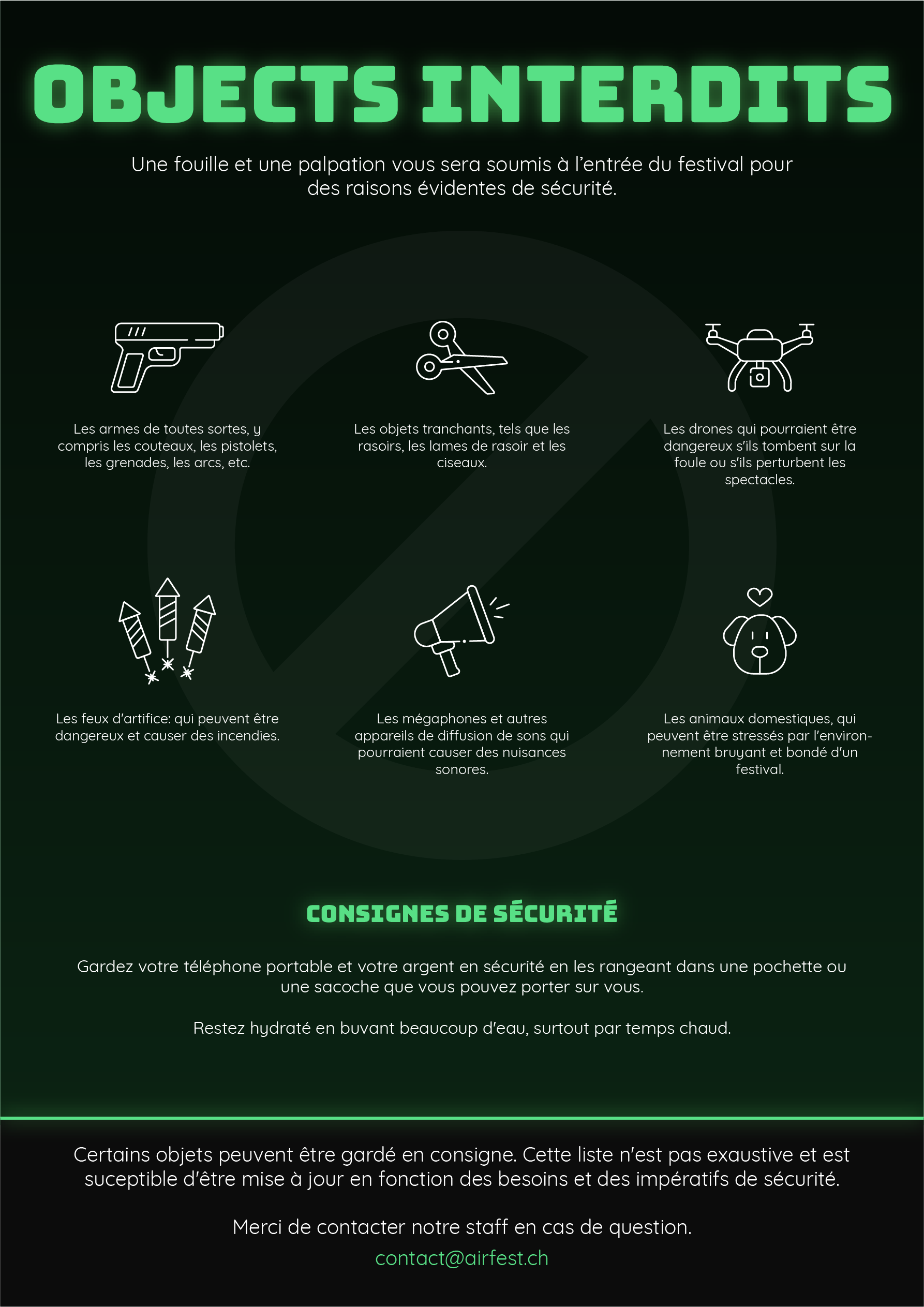 En résumé, tout objet jugé dangereux sera proscrit par le service d’ordre. Celui-ci s’octroi le droit de garder en consigne tout objet jugé dangereux pour la sécurité ou l’intégrité des spectateurs.